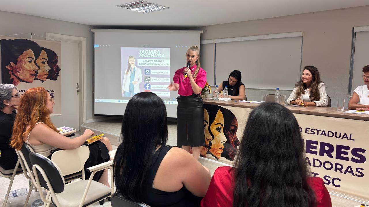 O 10º Encontro das Mulheres Trabalhadoras da NCST-SC teve um início marcado pelo debate sobre comunicação e protagonismo feminino nos espaços de decisão. Logo após a solenidade de abertura, as participantes acompanharam duas palestras que reforçaram a importância de dominar as ferramentas de comunicação para fortalecer a luta sindical e política.
